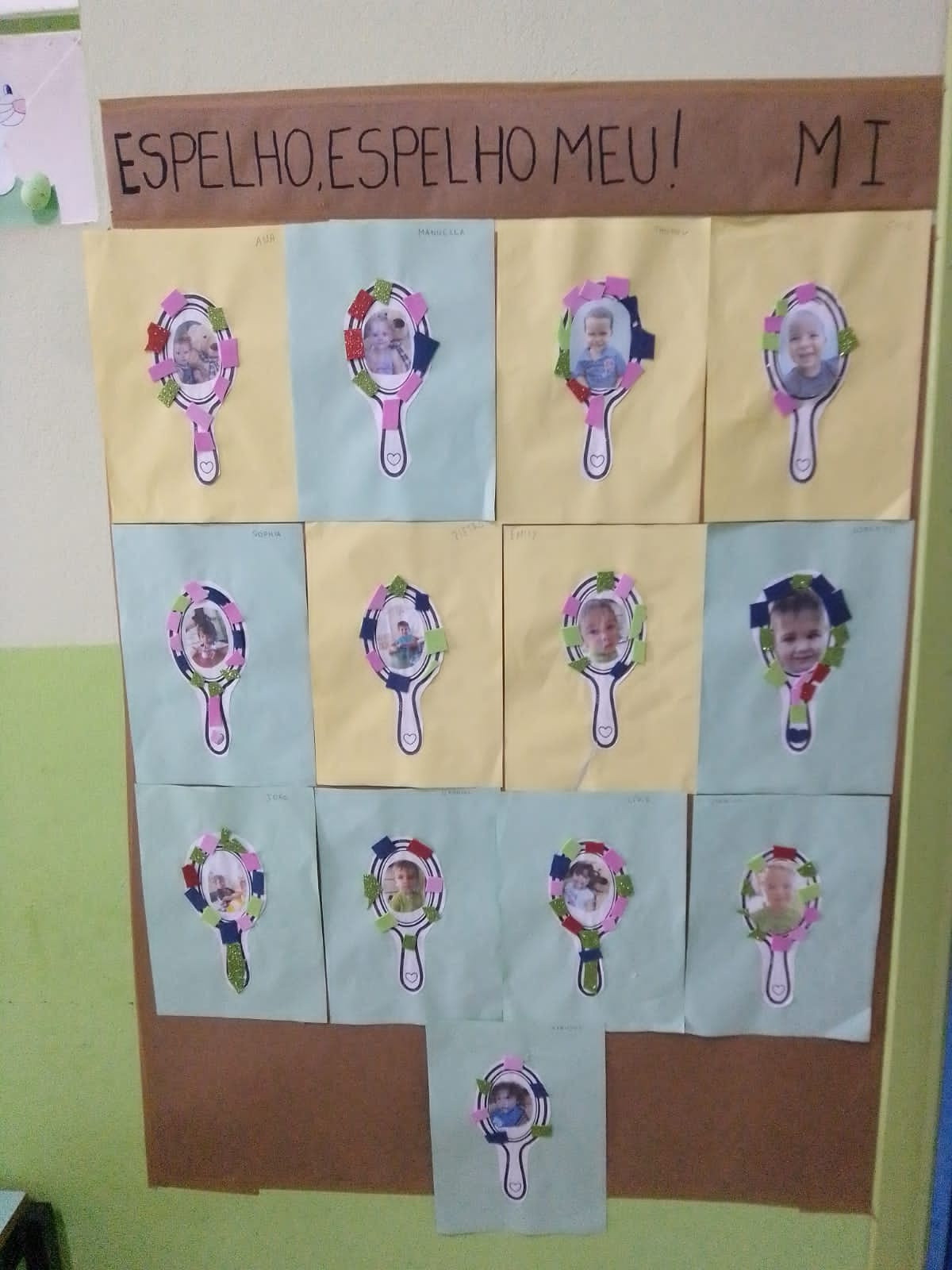 A criatividade das professoras para trabalharem o tema foi o destaque na utilização da história da Branca de Neve e os Sete Anões. A pergunta da bruxa malvada “Espelho, espelho meu...existe alguém mais bela do que eu...” deu um toque especial na aula, com a professora interpretando a frase fantasiada de bruxa. “Foi um momento mágico e as crianças vivenciaram com muita satisfação e curiosidade”, declararam. A atividade apresentada aos alunos foi o desenho de um espelho, em seguida a professora utiliza a caixa surpresa com as fotos dos aluno, em que cada um deveria achar a sua foto e colar no espelho, ficando o acabamento final por conta da criança, trabalhando assim também a coordenação motora fina.