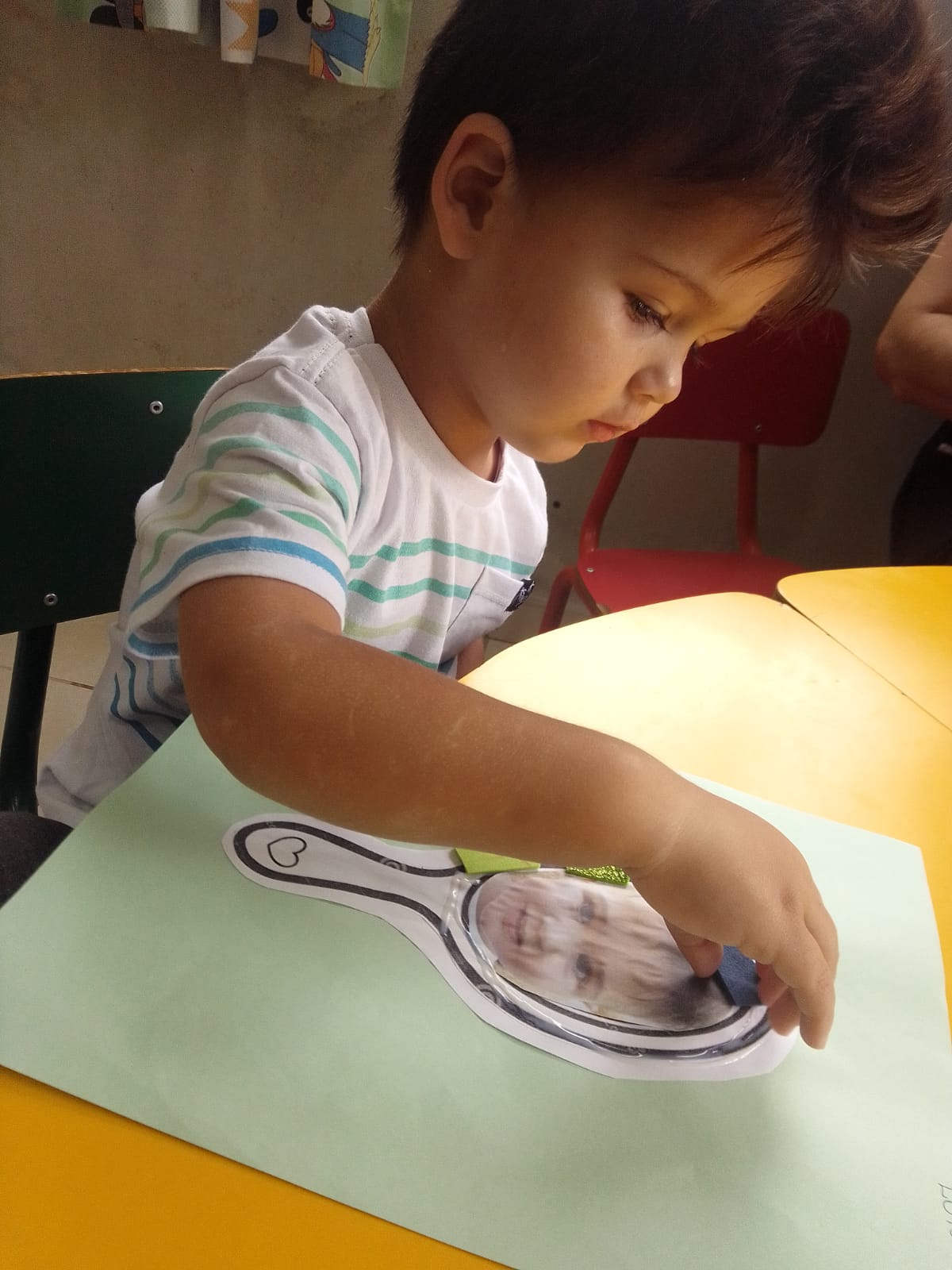 Houve ainda a brincadeira em frente ao espelho quando os alunos faziam caretas tristes, alegres, assustadas, de choro, com sono etc. Também assistiram ao filme “Cada um do seu jeito, cada jeito é de um...” e brincaram de adivinha quem é, conversando sobre a característica de cada um e ainda com músicas, trabalhando as partes do corpo.