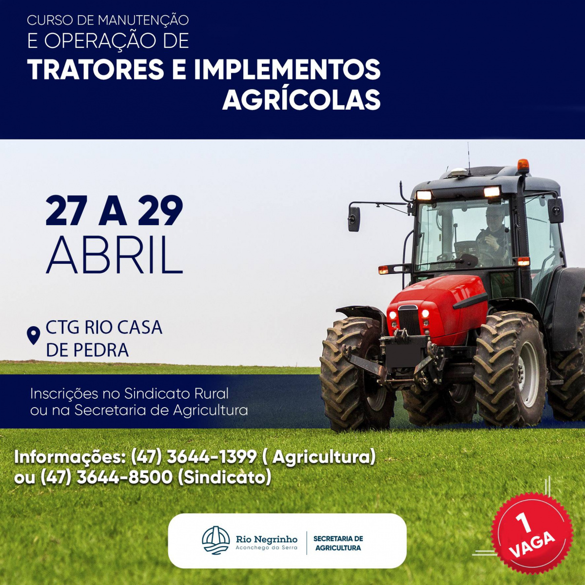 Última chamada para o curso gratuito de Manutenção e Operação de Tratores e Implementos Agrícolas. As inscrições podem ser feitas diretamente na secretaria de Agricultura ou no Sindicato Rural até a sexta-feira (22).