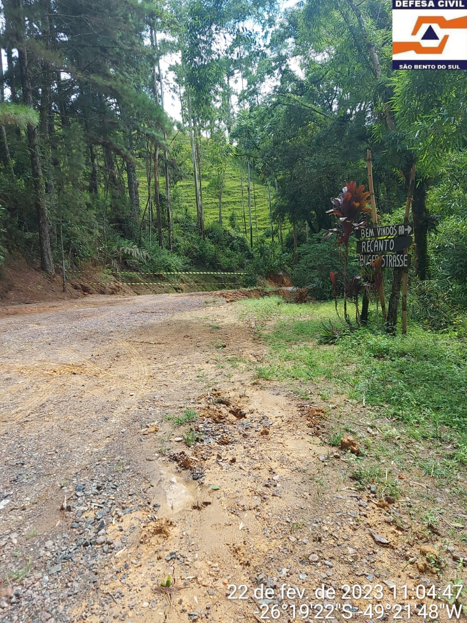 Após novos deslizamentos e rompimento da rede de tubulação, a Estrada dos Bugres foi totalmente interditada pela Defesa Civil de São Bento do Sul, nesta quarta-feira (22).