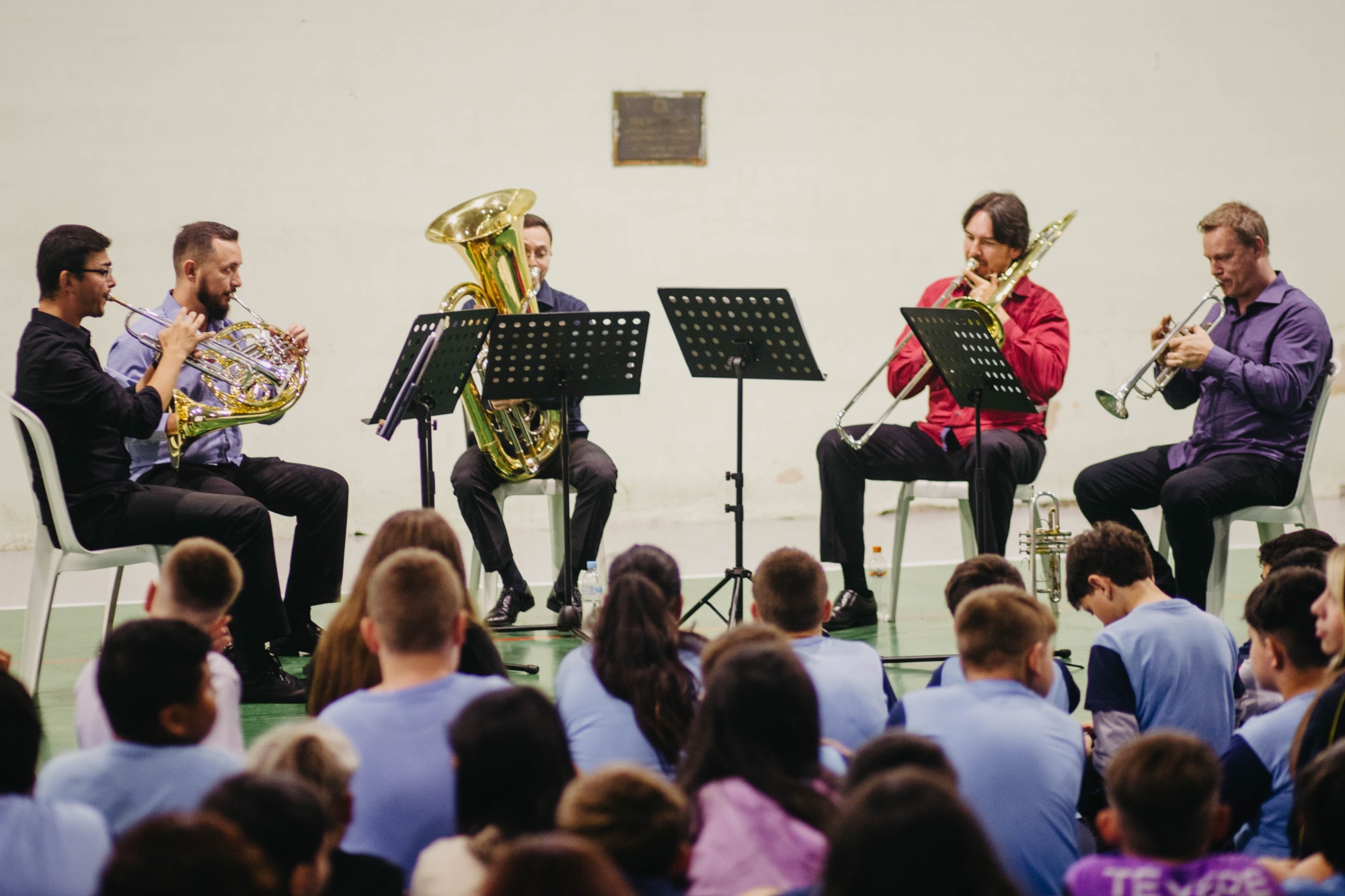 Até o momento, já foram realizadas quatro apresentações nas seguintes escolas: Baselisse Virmond, Sophia Schwedler, Adélia Lutz e Antônio Treml. Durante os concertos, os estudantes têm a oportunidade de conhecer de perto os instrumentos que compõem o quinteto de metais – trompete, trompa, trombone e tuba – além de aprender sobre a história, o funcionamento e curiosidades de cada um.