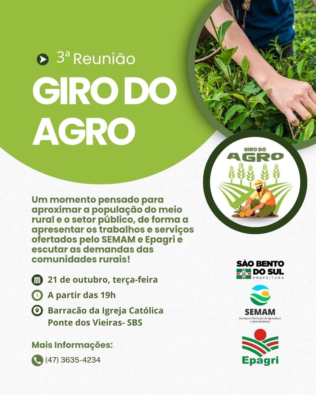 A Prefeitura de São Bento do Sul, por meio da Secretaria de Agricultura e Meio Ambiente, em parceria com a Epagri, promove nesta terça-feira (21) a terceira edição do programa Giro do Agro. O encontro será realizado a partir das 19h, no barracão da Igreja Católica da localidade da Ponte dos Vieiras.