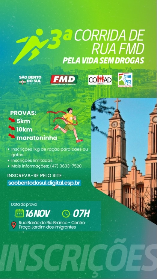 A Prefeitura Municipal de São Bento do Sul, por meio da Fundação Municipal de Desportos (FMD), em parceria com o Conselho Municipal Antidrogas (Comad), Grupo Condor e a Associação dos Triatletas e Corredores de Rua de São Bento do Sul (Atricor), promove no domingo, dia 16 de novembro, às 7 horas, a 3ª Edição da Corrida de Rua FMD, que neste ano traz o tema “Pela Vida sem Drogas”.