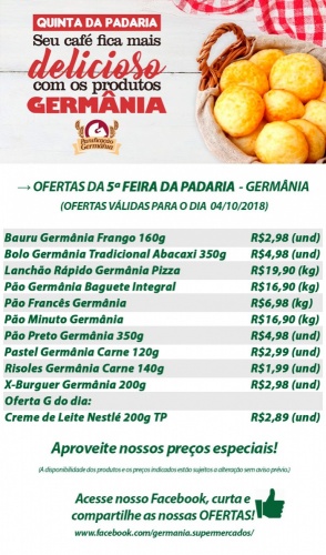 Ofertas do Germânia Supermercados para esta sexta, sábado e domingo, dias 05, 06 e 07/10/2018