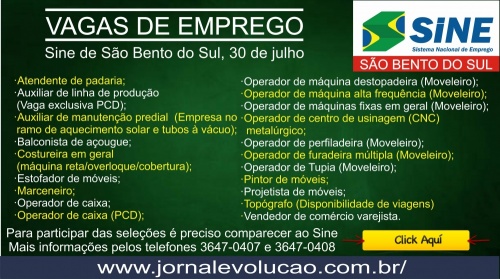 São Bento do Sul - Vagas de emprego disponíveis no Sine (30/07)