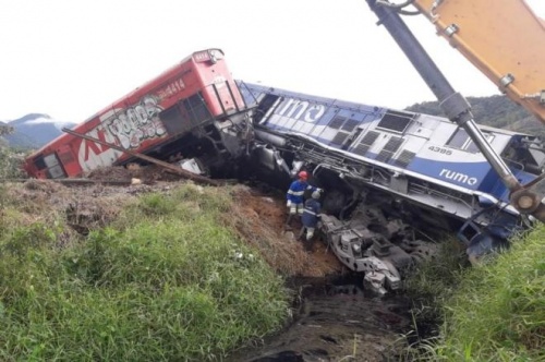 Trem descarrila após ser atingido por caminhão em Guaramirim e vazamento de óleo atingiu rio