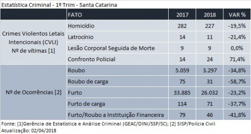 Santa Catarina apresenta redução de homicídios, latrocínios e roubos
