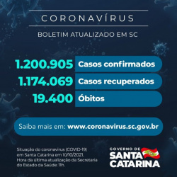 Coronavírus em SC: Estado confirma 1.687.549 casos, 1.662.463 recuperados e 21.709 mortes