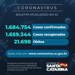 Coronavírus em SC: Estado confirma 1.684.754 casos, 1.659.344 recuperados e 21.698 mortes