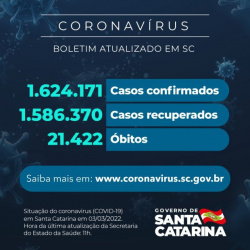 Coronavírus em SC: Estado confirma 1.624.171 casos, 1.586.370 recuperados e 21.422 mortes